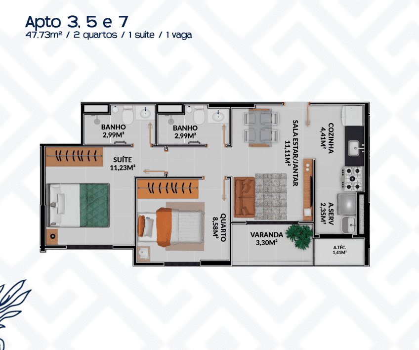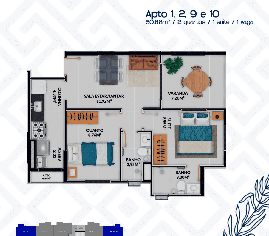 Com um estilo de vida prático e com qualidade, o Monte Athos oferece plantas de 02 quartos com ou sem suíte, todos com varandas privativas.