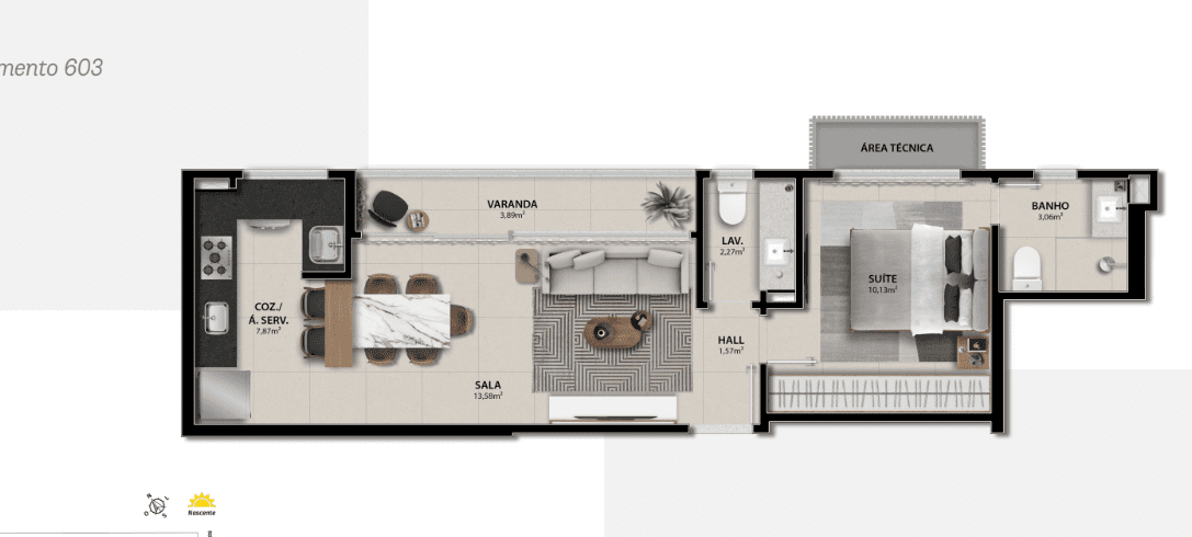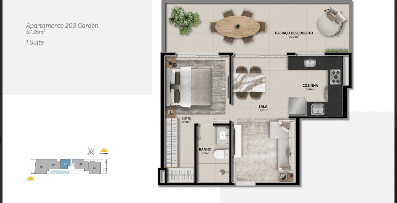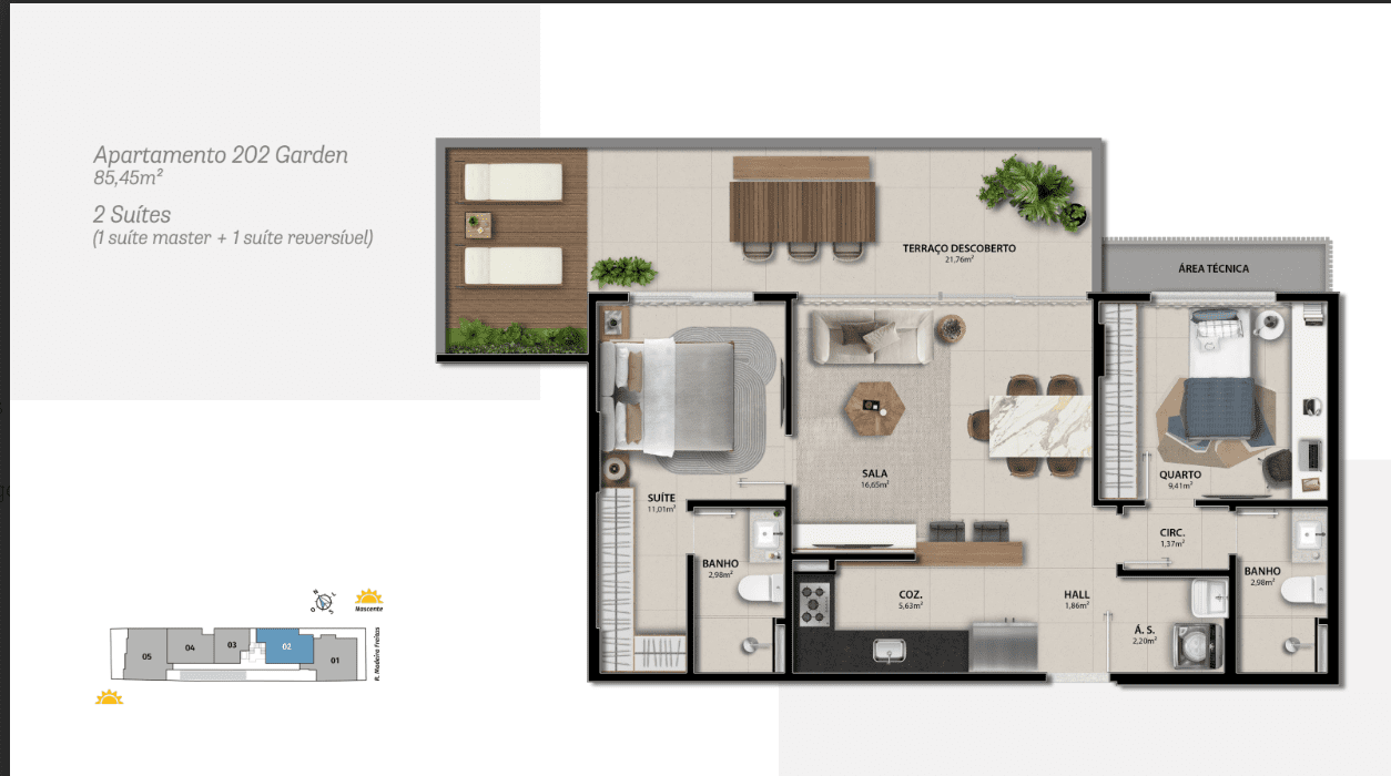 O AIR 225 é um empeendimento com apartamentos de 01 e 02 quartos com opções gardem.