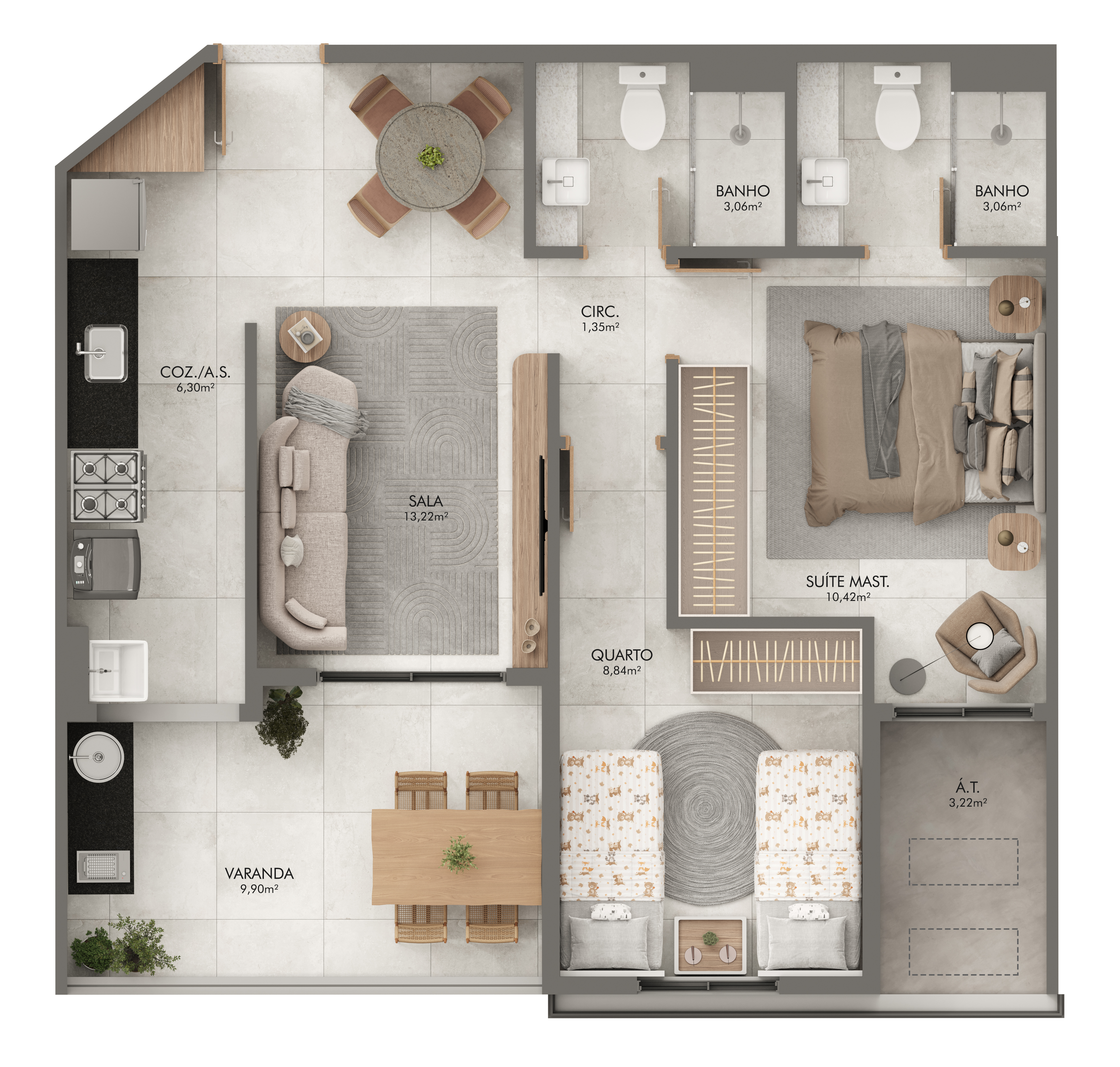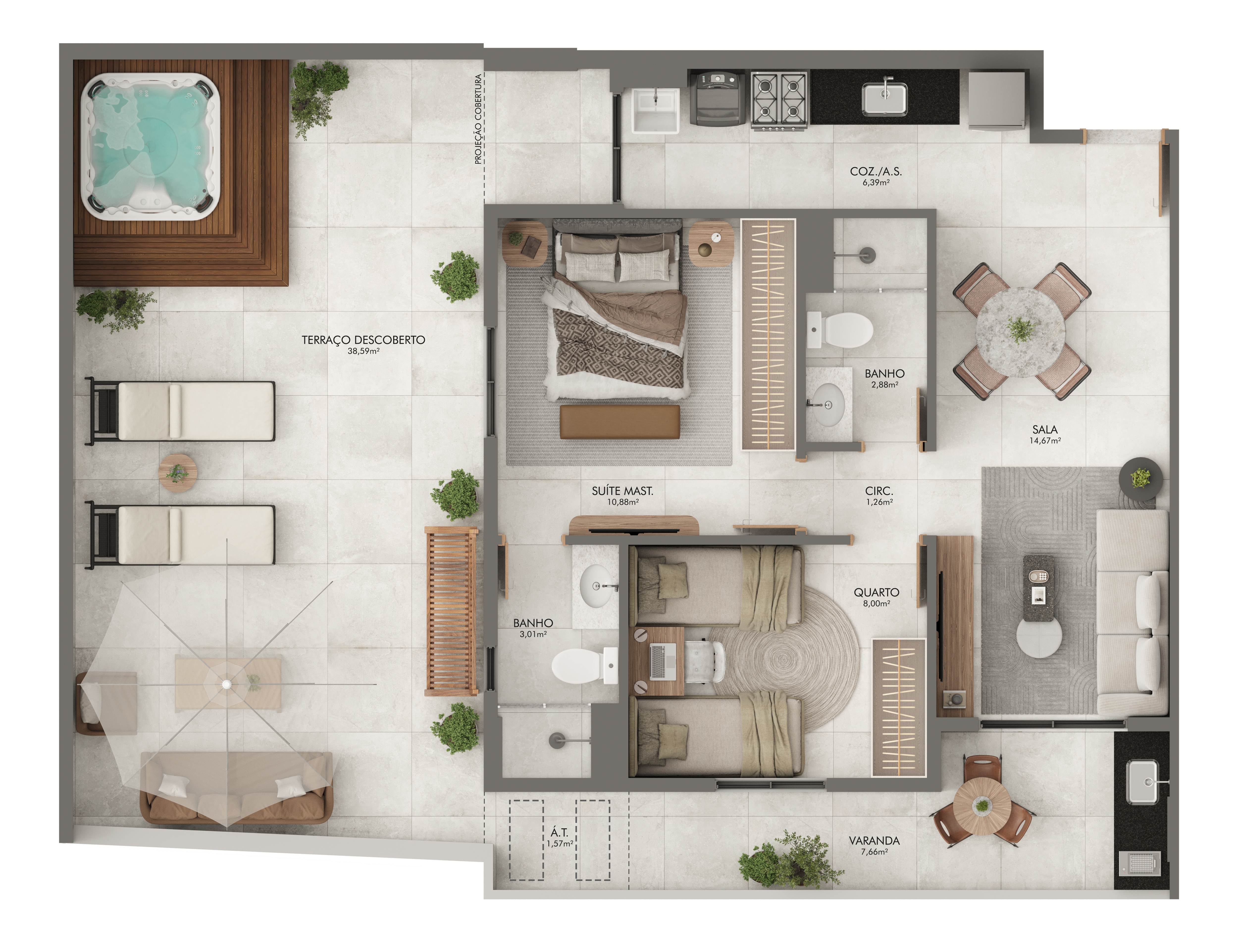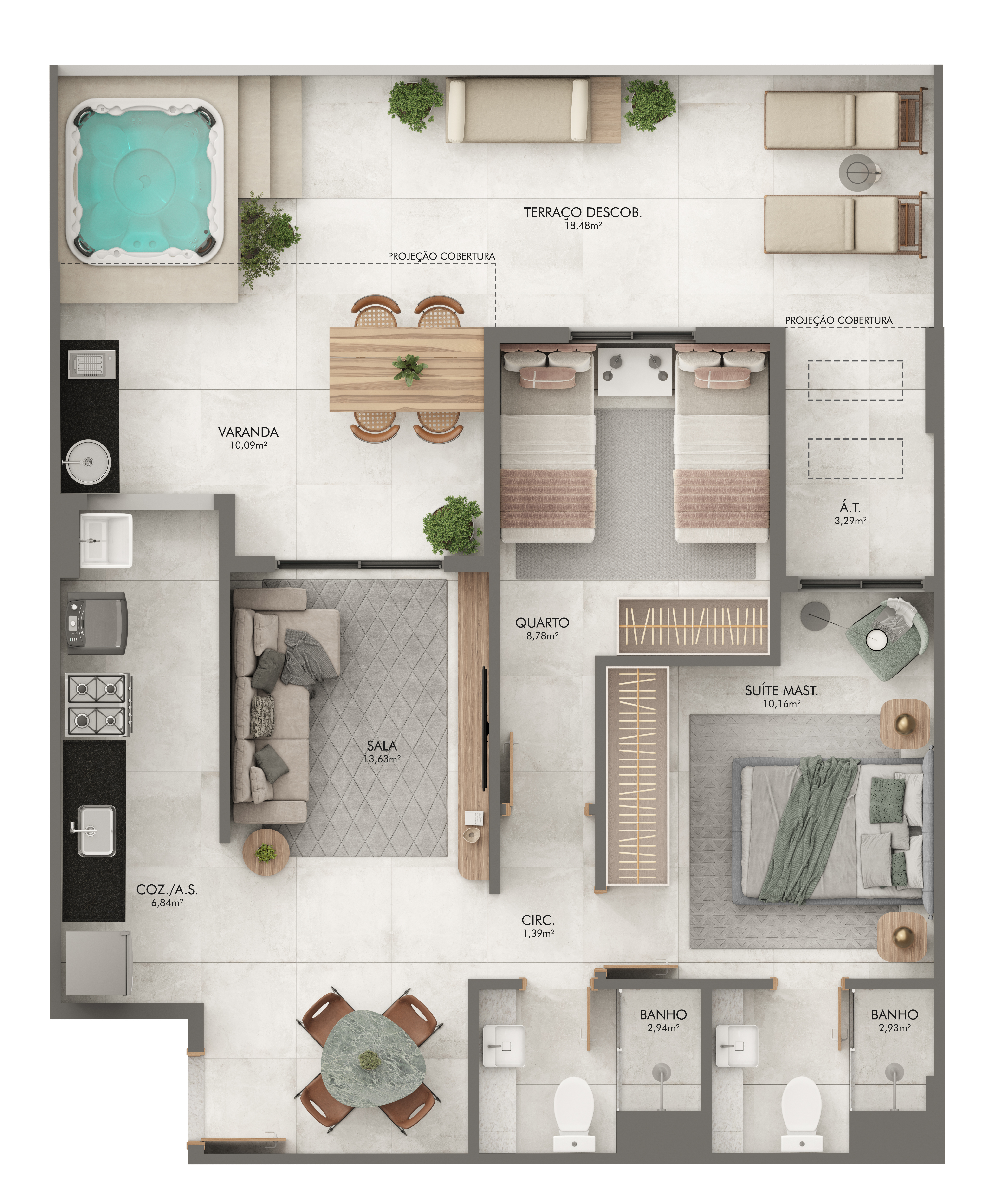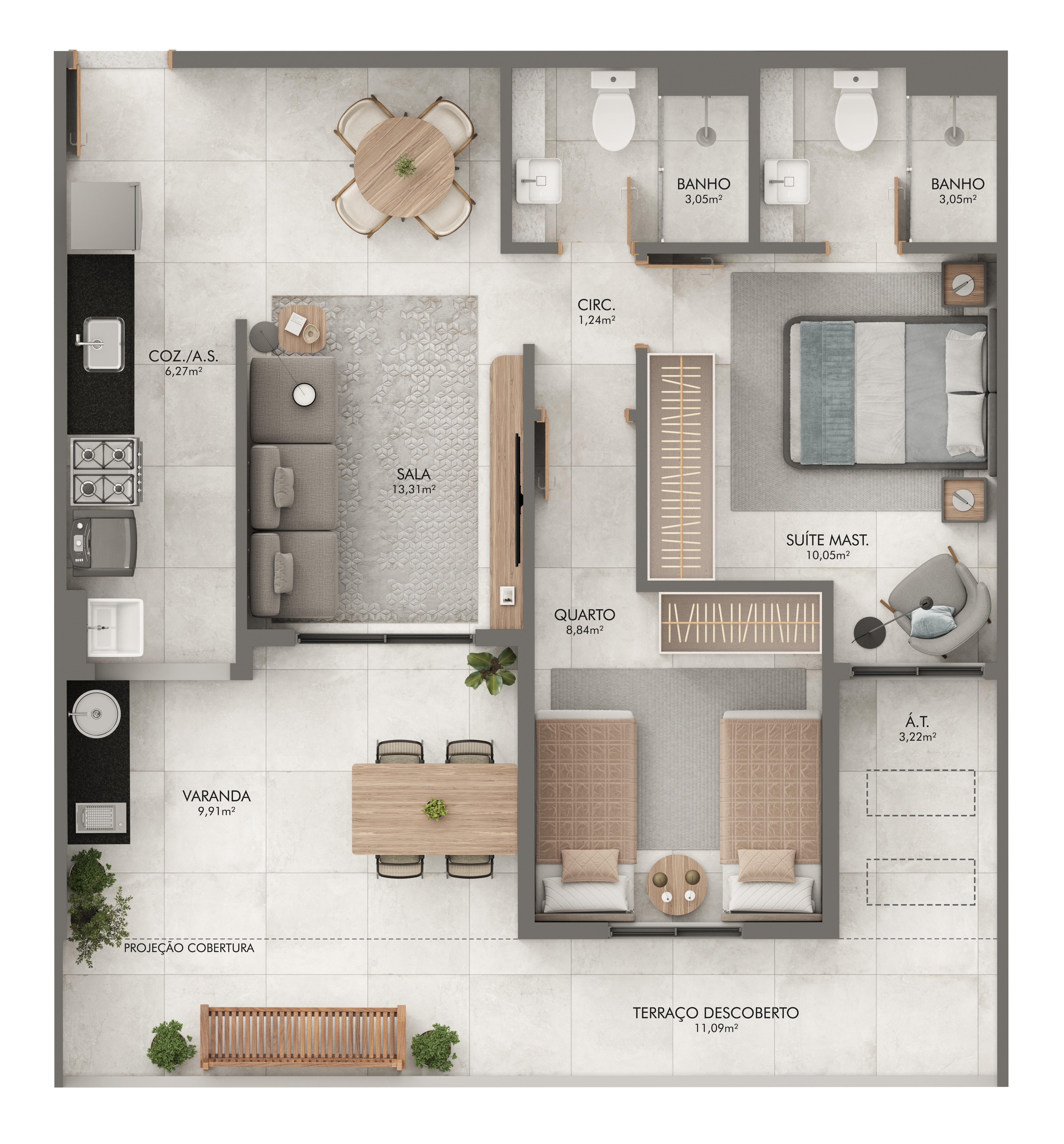 A Ilha Camburi oferece opções de apartamentos de 1 quarto (30 a 32 m² privativos) e 2 quartos (50 a 60 m²), além de 84 salas comerciais e 31 lojas distribuídas entre o boulevard externo e o mall interno. Os apartamentos variam de 87 a 131 m², com até 4 suítes, atendendo todas as expectativas residenciais e comerciais.