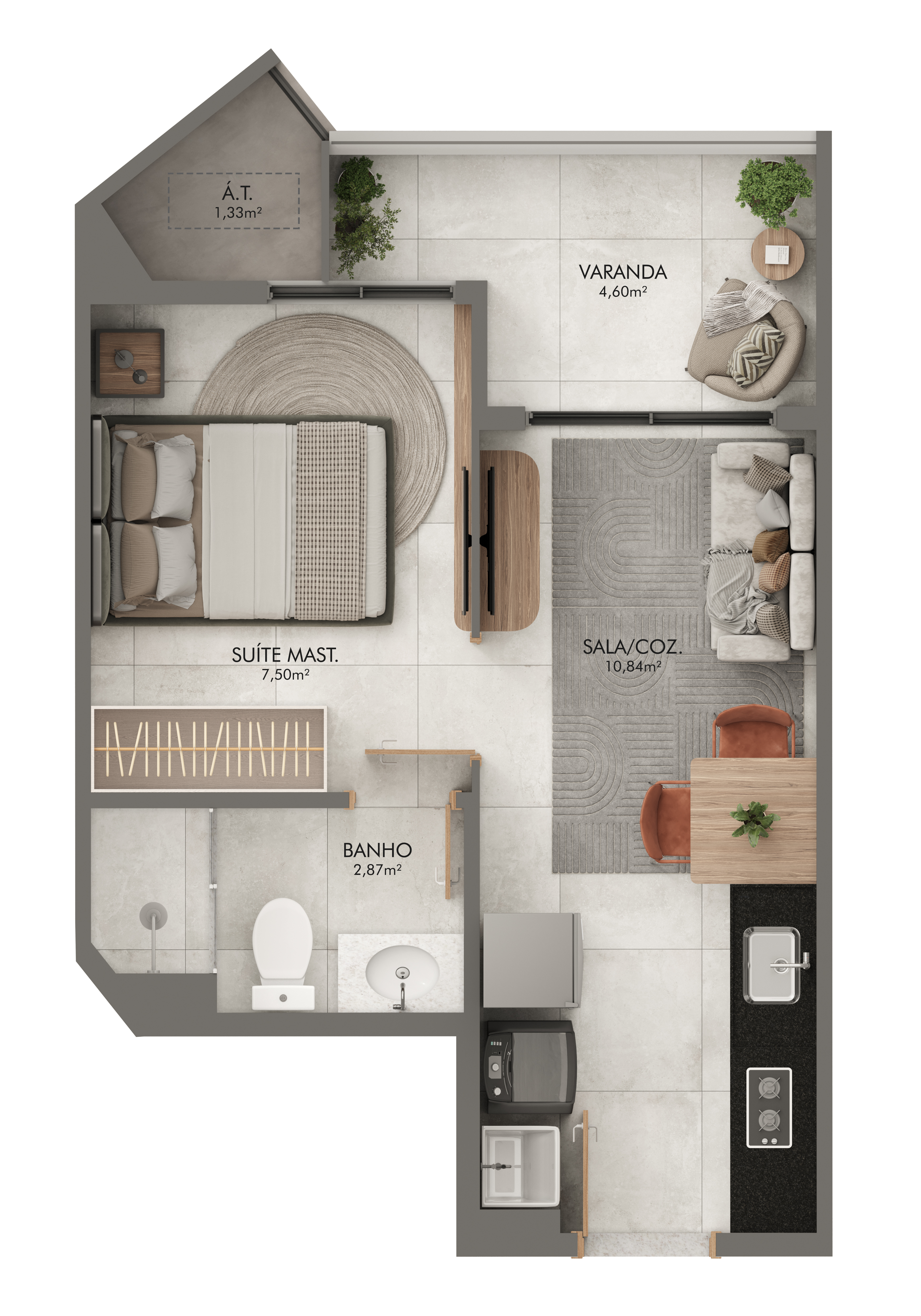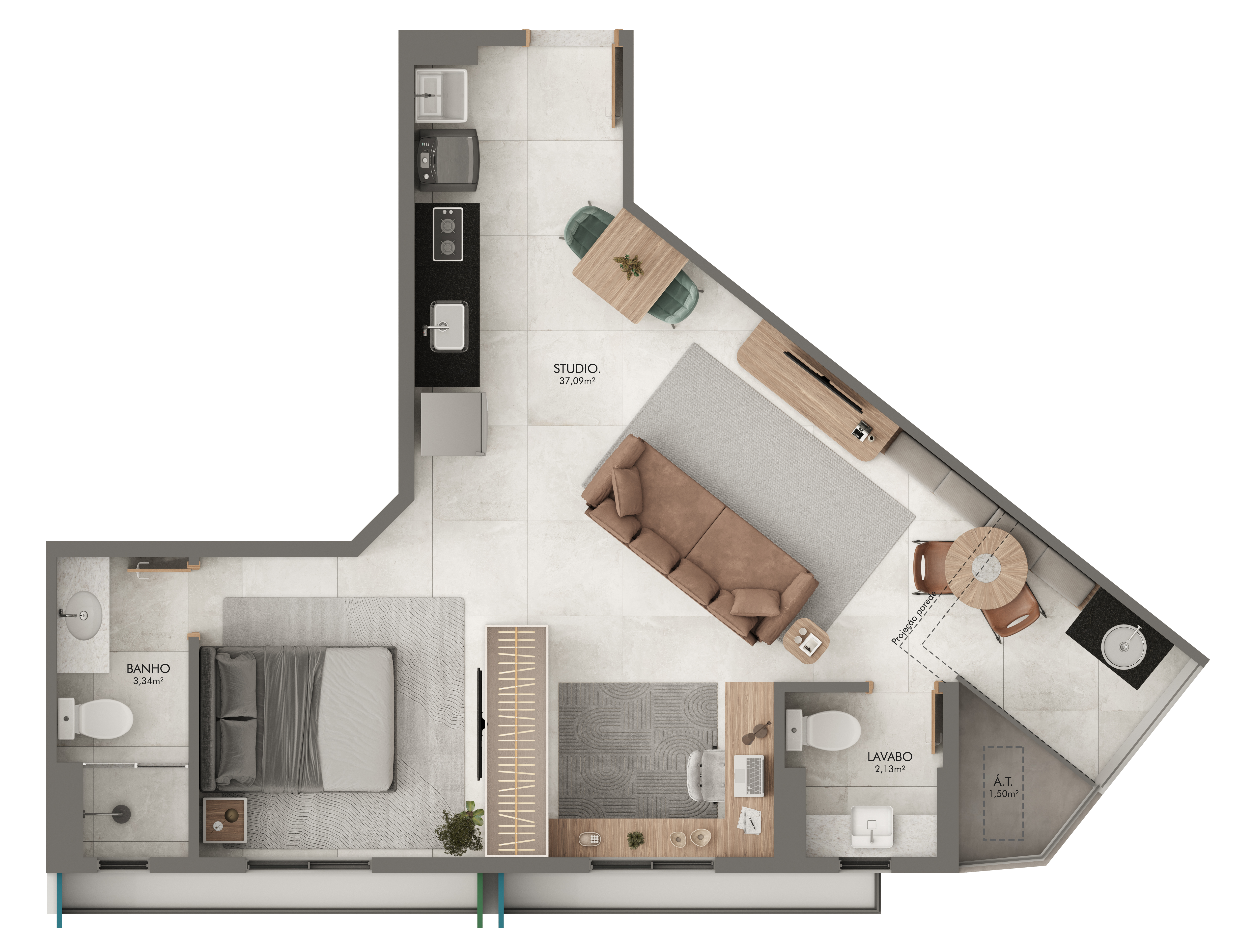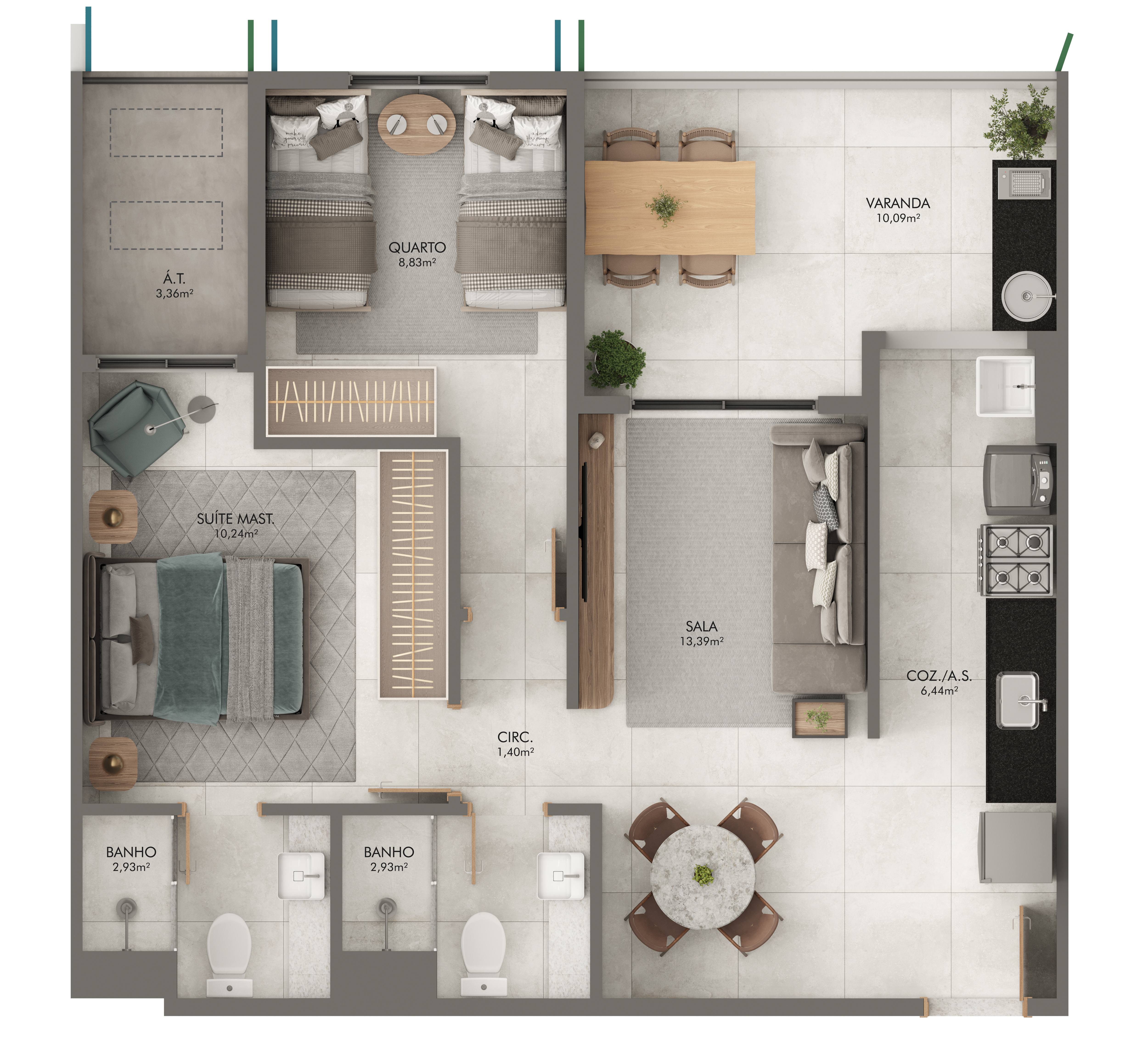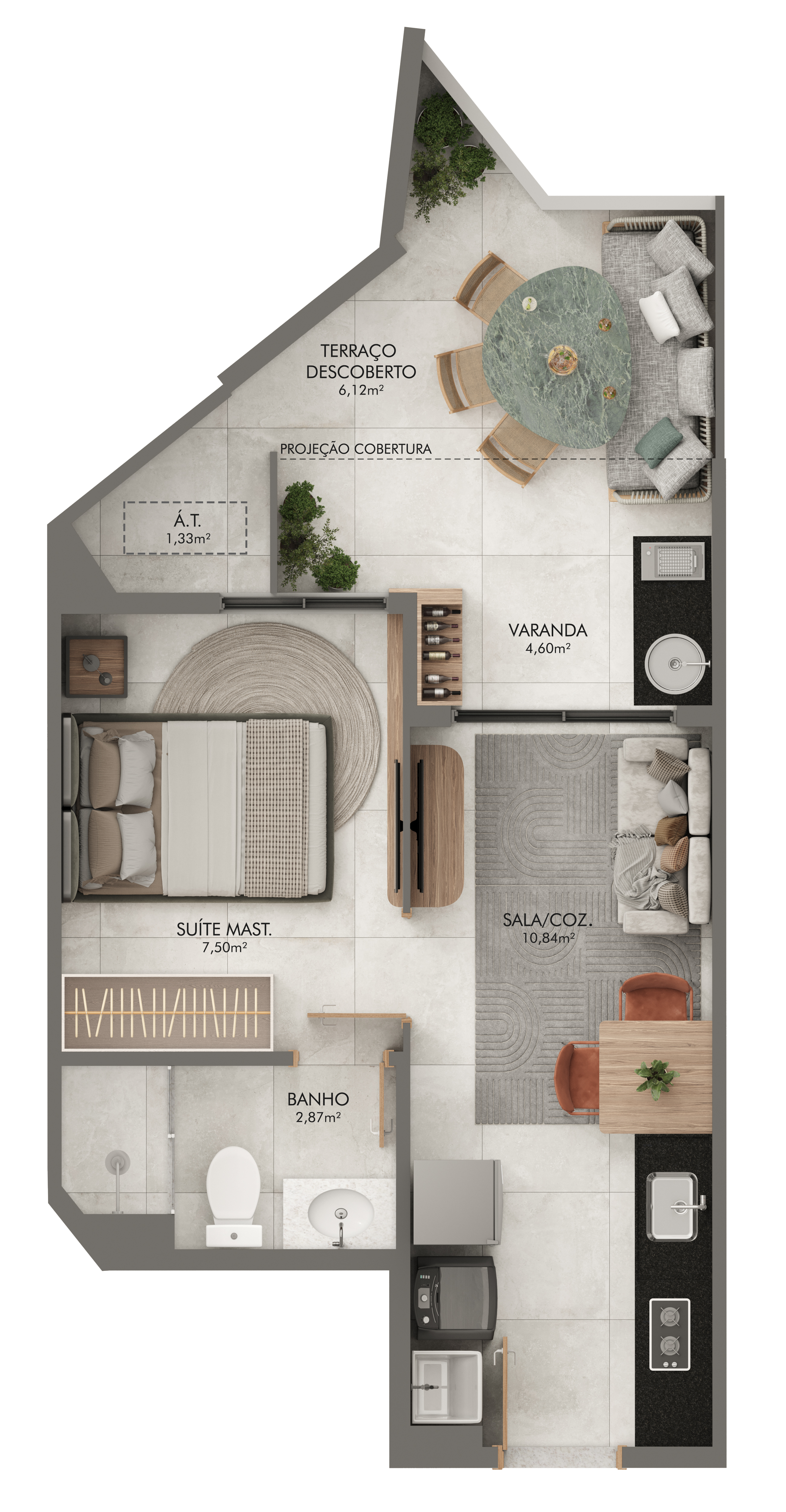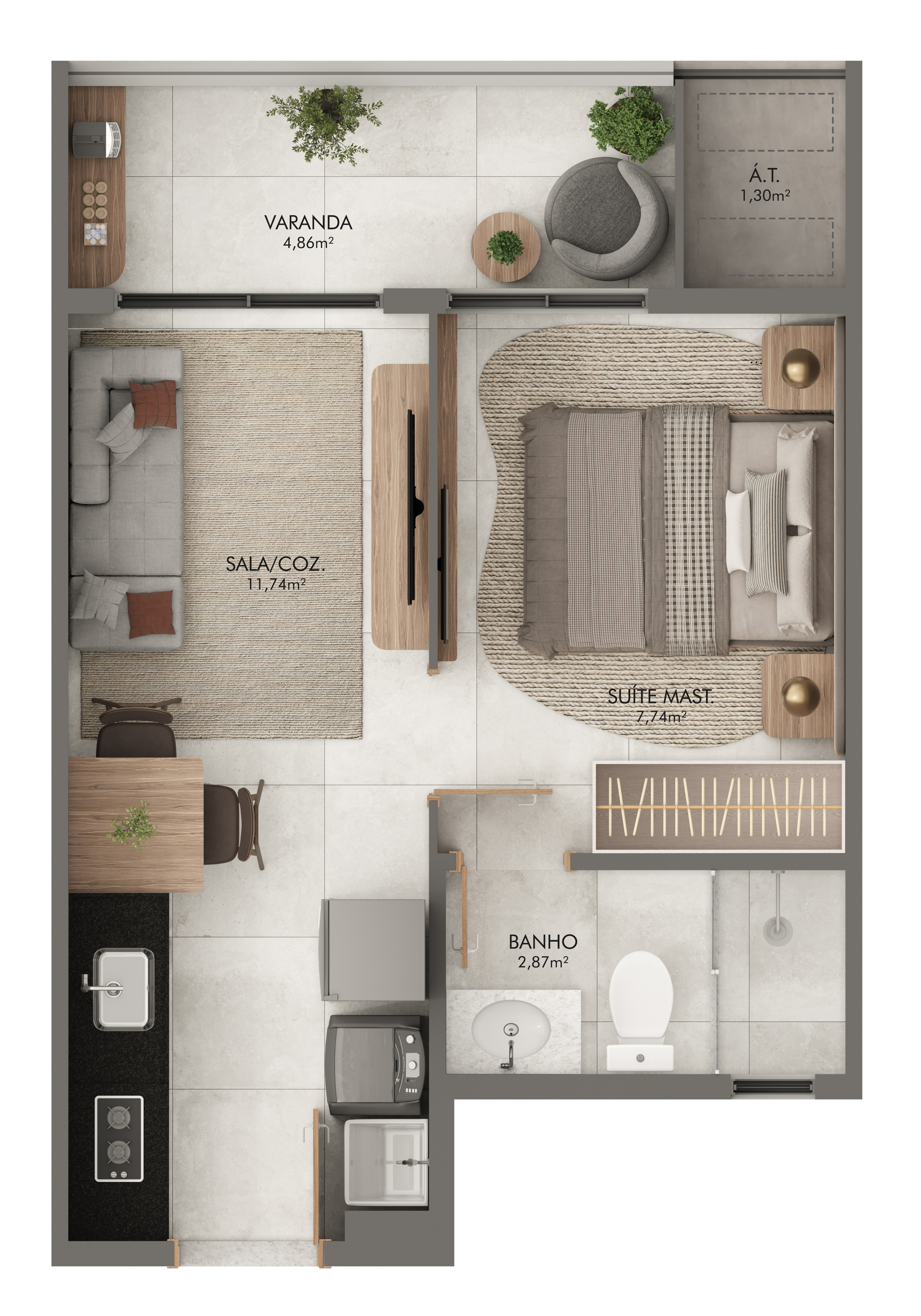 A Ilha Camburi oferece opções de apartamentos de 1 quarto (30 a 32 m² privativos) e 2 quartos (50 a 60 m²), além de 84 salas comerciais e 31 lojas distribuídas entre o boulevard externo e o mall interno. Os apartamentos variam de 87 a 131 m², com até 4 suítes, atendendo todas as expectativas residenciais e comerciais.
