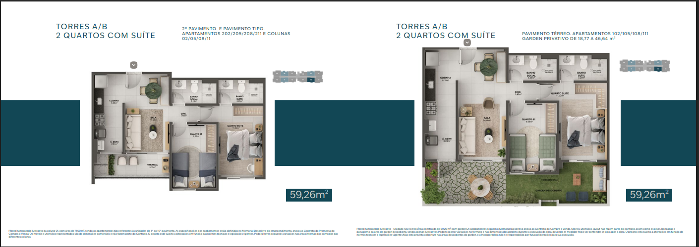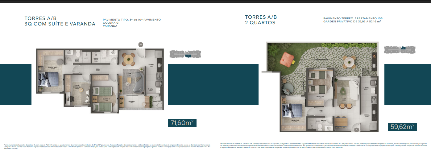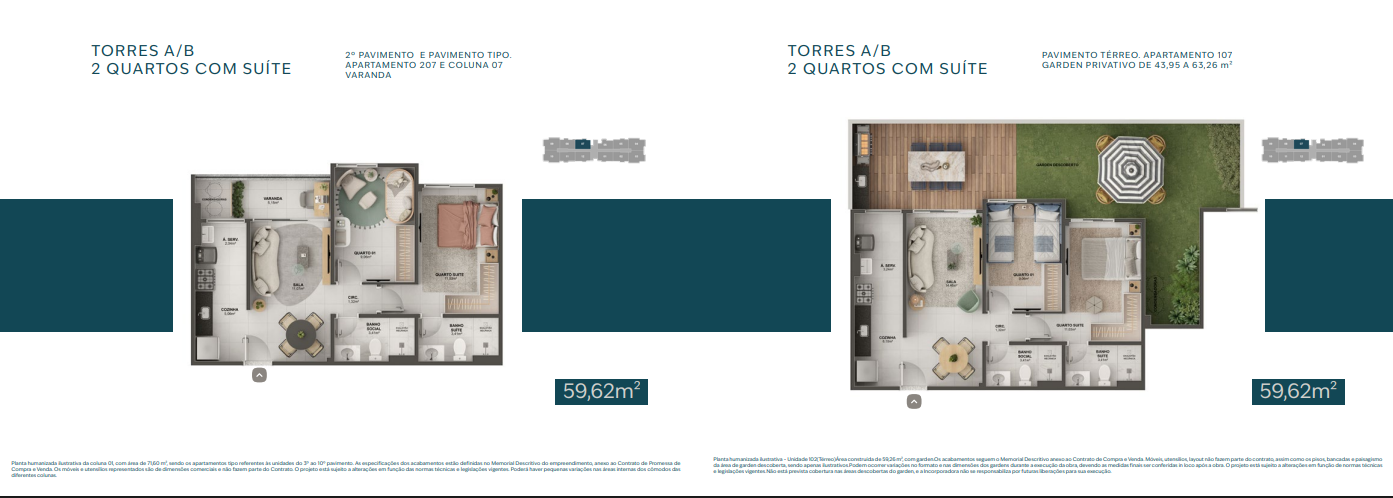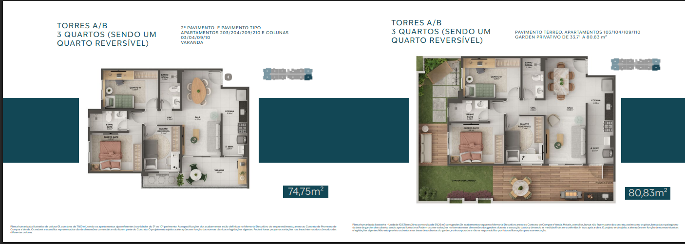 Apartamentos de 2 e 3 quartos com suíte e varanda.